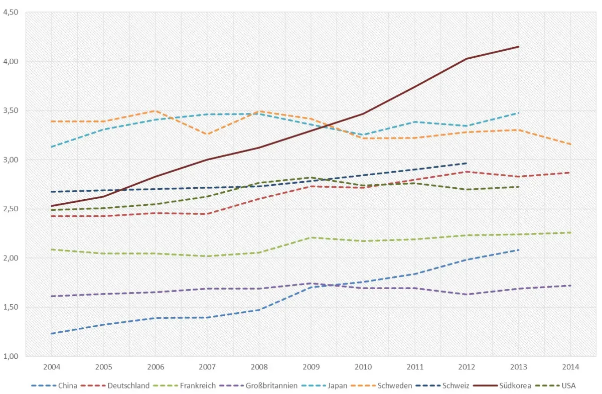Genaue Quellenangabe der Infografik: OECD, EUROSTAT. Berechnungen und Schätzungen des NIW in Schasse et al. (2016): "R&D Intensity (R&D share of GDP, South Korea).png", CC0
