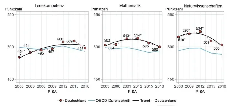 Dass sich die Leistungen der deutschen Schüler in Mathematik seit 2012 verschlechtert haben, bestätigen auch die Forscher um Reiss. In den Naturwissenschaften lag Deutschland bereits 2015 wieder merklich unter dem Stand von 2006, zwischen 2015 und 2018 gab es nun keine nennenswerte Veränderung mehr. Kristina Reiss schlussfolgert, die naturwissenschaftliche Kompetenz habe in Deutschland seit 2006 "wie in vielen anderen Staaten leicht, aber signifikant abgenommen". Beim Lesen dagegen sprechen die Forscher von ähnlichen Ergebnissen wie 2009, als Lesen zuletzt im Mittelpunkt der PISA-Studie stand. Die OECD formulierte in ihrer eigenen Pressemitteilung noch deutlicher: Der auch beim Leseverständnis verzeichnete Rückgang der Leistungen sei statistisch nicht belastbar. "Die Leistungen in Mathematik und Naturwissenschaften waren 2018 jedoch signifikant schlechter als 2012. Da sich der Leistungsrückgang bereits mit der PISA-Erhebung 2015 abzeichnete, ist eine breitere Ursachensuche angezeigt."