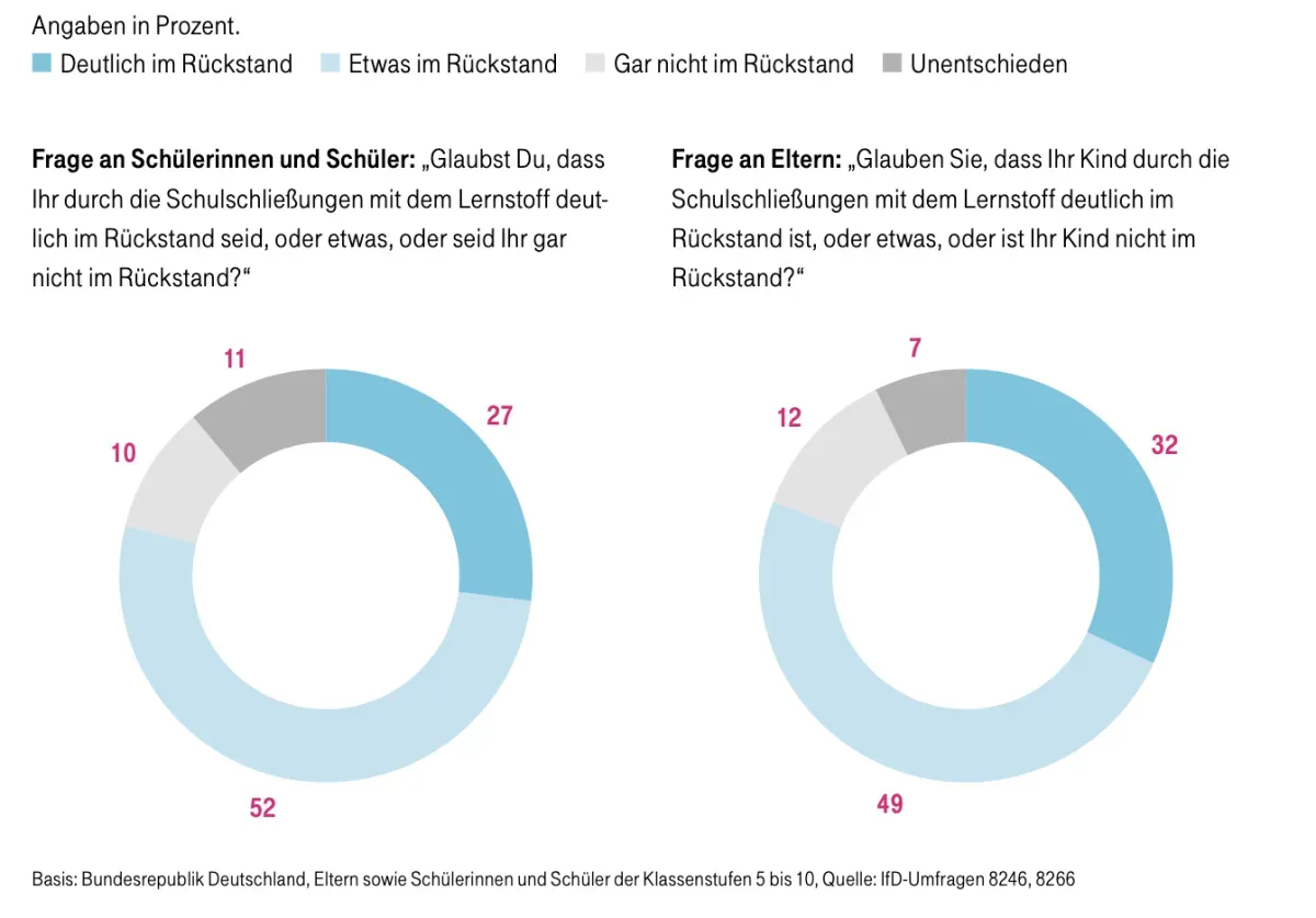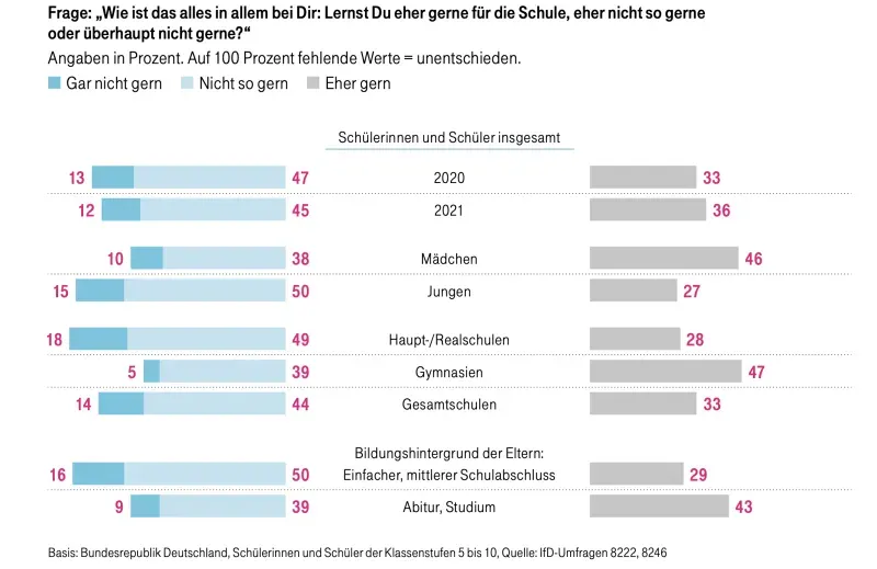 ES IST EINER der bisher seltenen Vorher-Nachher-Vergleiche. Direkt vor Beginn der Coronakrise, Anfang März 2020, hatte das Institut für Demoskopie Allensbach im Auftrag der Telekom-Stiftung Schüler und Eltern befragt. Es ging um ihre Einstellung zu Unterricht und Schule und zu außerschulischen Lernorten. Ein Jahr später und nach monatelangen Schulschließungen und Distanzunterricht hat Allensbach die repräsentative Studie wiederholt. Erneut gaben gut 1000 Kinder und Jugendliche der Klassenstufen 5 bis 10 Antwort, dazu 525 Eltern: Wie haben sie Lernen in Zeiten von Corona erlebt? Wie hat sich die Motivation der Schüler und ihre Perspektive aufs Lernen verändert?