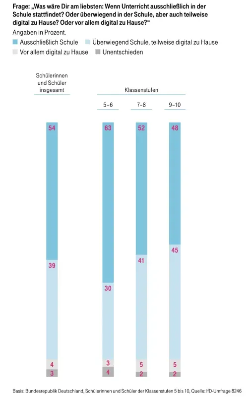 Zwei Drittel der Schüler wünschten sich, den Unterrichtsstoff wieder weitgehend von den Lehrkräften vermittelt zu bekommen, nur ein knappes Drittel wollte sich zumindest ab und zu selbst Inhalte erarbeiten. "Der Lehrer sollte festlegen, was und wie wir lernen sollen, das ist seine Aufgabe": Dieser Aussage stimmten in diesem Jahr 30 Prozent der Schüler zu – sieben Prozentpunkte mehr als 2020 vor den Schulschließungen. 54 Prozent wollten, dass auch künftig der Unterricht ausschließlich in der Schule stattfindet – und nur vier Prozent "vor allem digital zu Hause". Von den Eltern forderten sogar 74 Prozent Komplett-Beschulung vor Ort.