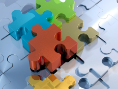 • Metallisch schimmernde Puzzleteile, teils silbern, teils bunt, die sich dynamisch ineinander fügen.