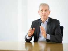 • Porträtfoto von Jens Scholz, am Tisch sitzend, gestikulierend.